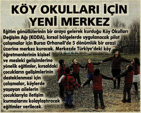 KÖY OKULLARI İÇİN YENİ MERKEZ Eğitim gönüllülerinin bir araya gelerek kurduğu Köy Okulları Değişim Ağı (KODA), kırsal bölgelerde uygulanacak pilot | çalışmalar için Bursa Orhaneli'nde 5 dönümlük bir arazi üzerine merkez kuracak. Merkezde Türkiye'deki köy, öğretmenlerinin kişisel ve mesleki gelişimlerine yönelik eğitimler, kırsaldaki r çocukların gelişimlerinin ' desteklenmesi için çalışmalar, köylerde yaşayan ailelerin çocuklarıyla iletişim kurmalarını kolaylaştıracak eğitimler verilecek.