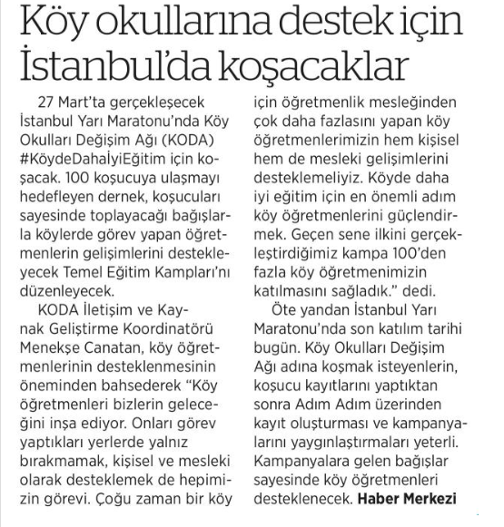 Köy okullarına destek için İstanbul'da koşacaklar 27 Mart'ta gerçekleşecek istanbul Yarı Maratonu'nda Köy Okulları Değişim Ağı (KODA) #KöydeDahaiyiEğitim için koşacak. 100 koşucuya ulaşmayı hedefleyen dernek, koşucuları sayesinde toplayacağı bağışlarla köylerde görev yapan öğretmenlerin gelişimlerini destekleyecek Temel Eğitim Kampları'nı düzenleyecek. KODA iletişim ve Kaynak Geliştirme Koordinatörü Menekşe Canatan, köy öğretmenlerinin desteklenmesinin öneminden bahsederek "Köy öğretmenleri bizlerin geleceğini inşa ediyor. Onları görev yaptıkları yerlerde yalnız bırakmamak, kişisel ve mesleki olarak desteklemek de hepimizin görevi. Çoğu zaman bir köy için öğretmenlik mesleğinden çok daha fazlasını yapan köy öğretmenlerimizin hem kişisel hem de mesleki gelişimlerini desteklemeliyiz. Köyde daha iyi eğitim için en önemli adım köy öğretmenlerini güçlendirmek. Geçen sene ilkini gerçekleştirdiğimiz kampa 100'den fazla köy öğretmenimizin katılmasını sağladık." dedi. Öte yandan istanbul Yarı Maratonu'nda son katılım tarihi bugün. Köy Okulları Değişim Ağı adına koşmak isteyenlerin, koşucu kayıtlarını yaptıktan sonra Adım Adım üzerinden kayıt oluşturması ve kampanyalarını yaygınlaştırmaları yeterli. Kampanyalara gelen bağışlar sayesinde köy öğretmenleri desteklenecek.