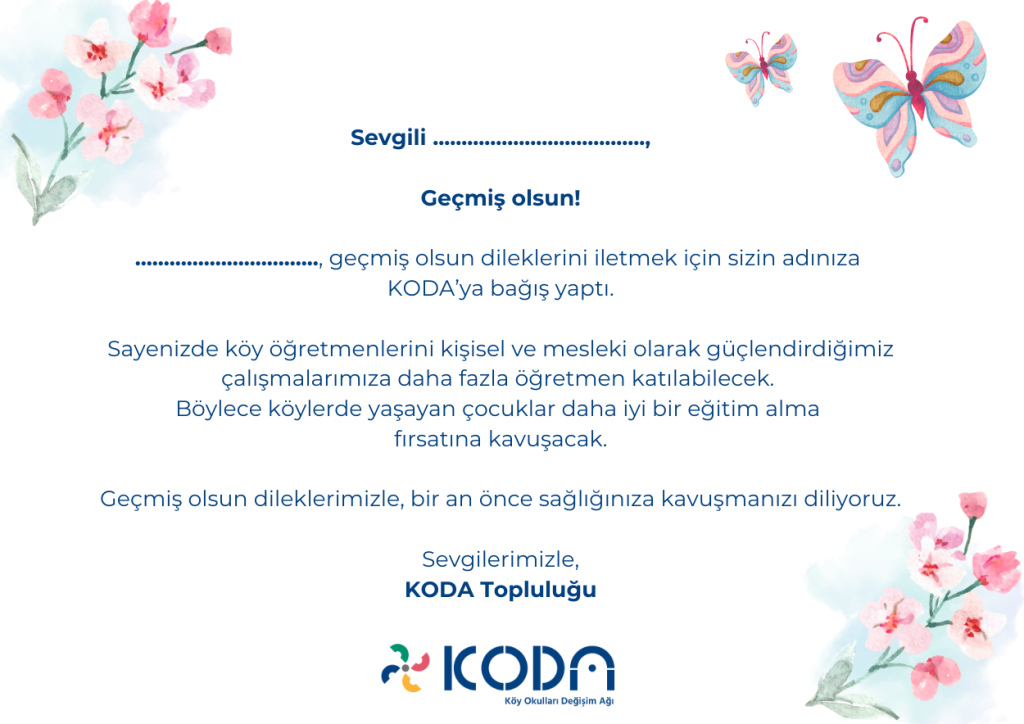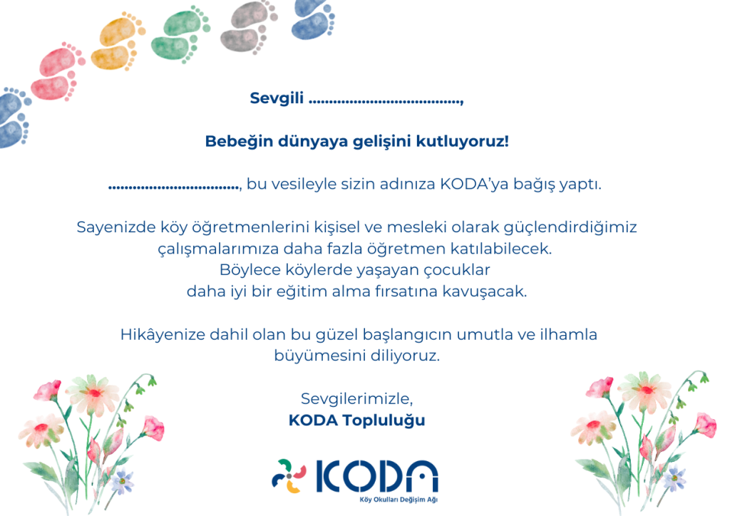 Kaybettiğiniz sevdiklerinizin anısına veya yakınlarına başsağlığı dilemek için yapabileceğiniz bir bağış türüdür. KODA olarak, bu bağışınız karşılığında iletmek istediğiniz yere Taziye Sertifikası gönderiyoruz. Böylece hem sevdiklerinizin hatırası onurlandırılır, hem de köylerdeki çocukların eğitimi desteklenir.